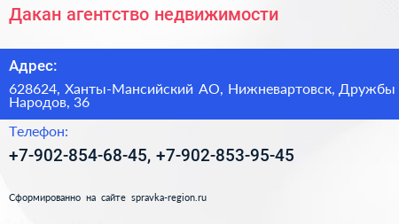 Дакан, агентство недвижимости по адресу 628624, Ханты-Мансийский АО, Нижневартовск, Дружбы Народов, 36 в дальнейшем Организация, размещена в следующих категориях: