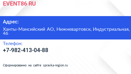 EVENT86.RU по адресу Ханты-Мансийский АО, Нижневартовск, Индустриальная, 46 в дальнейшем Организация, размещена в следующих категориях:
