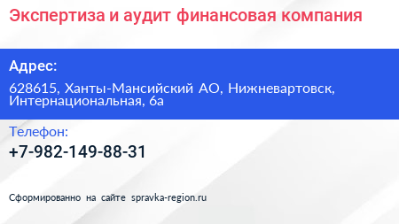 Экспертиза и аудит, финансовая компания по адресу 628615, Ханты-Мансийский АО, Нижневартовск, Интернациональная, 6а в дальнейшем Организация, размещена в следующих категориях: