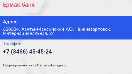 Ермак, банк по адресу 628624, Ханты-Мансийский АО, Нижневартовск, Интернациональная, 24 в дальнейшем Организация, размещена в следующих категориях: