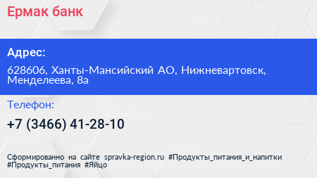 Ермак, банк по адресу 628606, Ханты-Мансийский АО, Нижневартовск, Менделеева, 8а в дальнейшем Организация, размещена в следующих категориях: