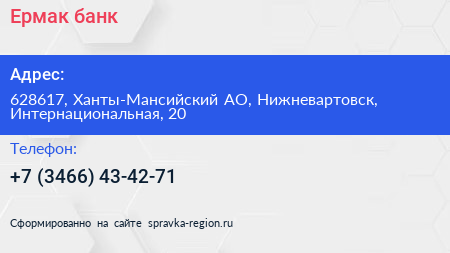 Ермак, банк по адресу 628617, Ханты-Мансийский АО, Нижневартовск, Интернациональная, 20 в дальнейшем Организация, размещена в следующих категориях: