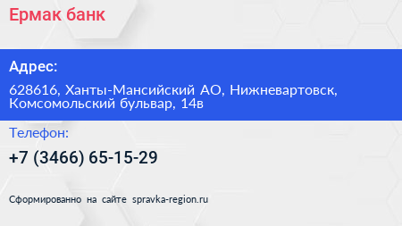 Ермак, банк по адресу 628616, Ханты-Мансийский АО, Нижневартовск, Комсомольский бульвар, 14в в дальнейшем Организация, размещена в следующих категориях: