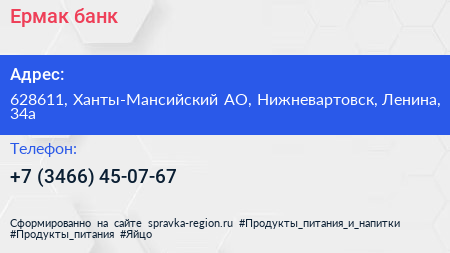 Ермак, банк по адресу 628611, Ханты-Мансийский АО, Нижневартовск, Ленина, 34а в дальнейшем Организация, размещена в следующих категориях: