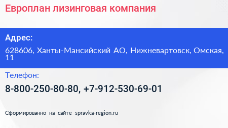 Европлан, лизинговая компания по адресу 628606, Ханты-Мансийский АО, Нижневартовск, Омская, 11 в дальнейшем Организация, размещена в следующих категориях: