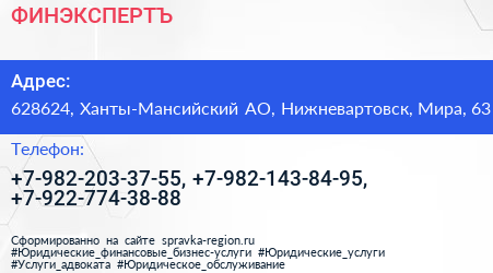 ФИНЭКСПЕРТЪ по адресу 628624, Ханты-Мансийский АО, Нижневартовск, Мира, 63 в дальнейшем Организация, размещена в следующих категориях:
