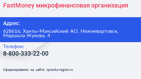 FastMoney, микрофинансовая организация по адресу 628616, Ханты-Мансийский АО, Нижневартовск, Маршала Жукова, 4 в дальнейшем Организация, размещена в следующих категориях: