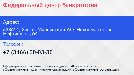 Федеральный центр банкротства по адресу 628611, Ханты-Мансийский АО, Нижневартовск, Нефтяников, 64 в дальнейшем Организация, размещена в следующих категориях: