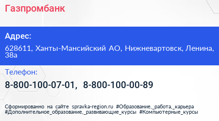 Газпромбанк по адресу 628611, Ханты-Мансийский АО, Нижневартовск, Ленина, 38а в дальнейшем Организация, размещена в следующих категориях: