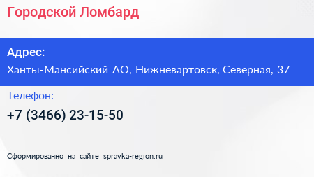 Городской Ломбард по адресу Ханты-Мансийский АО, Нижневартовск, Северная, 37 в дальнейшем Организация, размещена в следующих категориях: