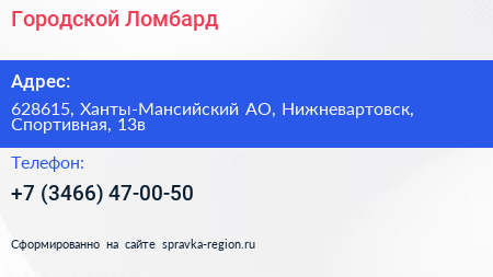 Городской Ломбард по адресу 628615, Ханты-Мансийский АО, Нижневартовск, Спортивная, 13в в дальнейшем Организация, размещена в следующих категориях: