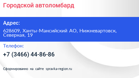 Городской автоломбард по адресу 628609, Ханты-Мансийский АО, Нижневартовск, Северная, 19 в дальнейшем Организация, размещена в следующих категориях:
