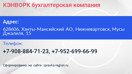 КЭНВОРК, бухгалтерская компания по адресу 628606, Ханты-Мансийский АО, Нижневартовск, Мусы Джалиля, 15 в дальнейшем Организация, размещена в следующих категориях: