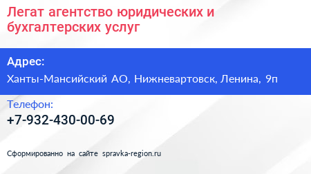 Легат, агентство юридических и бухгалтерских услуг по адресу Ханты-Мансийский АО, Нижневартовск, Ленина, 9п в дальнейшем Организация, размещена в следующих категориях: