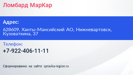 Ломбард МарКар по адресу 628609, Ханты-Мансийский АО, Нижневартовск, Кузоваткина, 37 в дальнейшем Организация, размещена в следующих категориях: