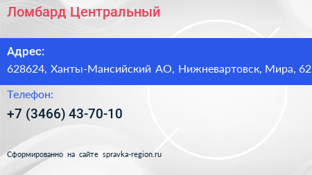 Ломбард Центральный по адресу 628624, Ханты-Мансийский АО, Нижневартовск, Мира, 62 в дальнейшем Организация, размещена в следующих категориях: