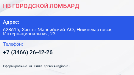 НВ ГОРОДСКОЙ ЛОМБАРД по адресу 628615, Ханты-Мансийский АО, Нижневартовск, Интернациональная, 23 в дальнейшем Организация, размещена в следующих категориях:
