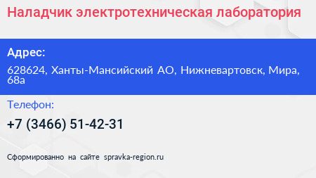 Наладчик, электротехническая лаборатория по адресу 628624, Ханты-Мансийский АО, Нижневартовск, Мира, 68а в дальнейшем Организация, размещена в следующих категориях: