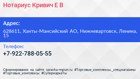 Нотариус Кривич Е.В. по адресу 628611, Ханты-Мансийский АО, Нижневартовск, Ленина, 15 в дальнейшем Организация, размещена в следующих категориях: