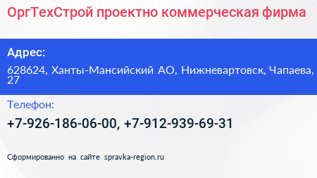 ОргТехСтрой, проектно-коммерческая фирма по адресу 628624, Ханты-Мансийский АО, Нижневартовск, Чапаева, 27 в дальнейшем Организация, размещена в следующих категориях: