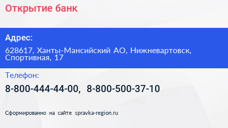 Открытие, банк по адресу 628617, Ханты-Мансийский АО, Нижневартовск, Спортивная, 17 в дальнейшем Организация, размещена в следующих категориях: