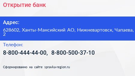 Открытие, банк по адресу 628602, Ханты-Мансийский АО, Нижневартовск, Чапаева, 2 в дальнейшем Организация, размещена в следующих категориях: