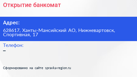 Открытие, банкомат по адресу 628617, Ханты-Мансийский АО, Нижневартовск, Спортивная, 17 в дальнейшем Организация, размещена в следующих категориях: