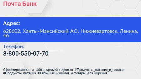 Почта Банк по адресу 628602, Ханты-Мансийский АО, Нижневартовск, Ленина, 46 в дальнейшем Организация, размещена в следующих категориях: