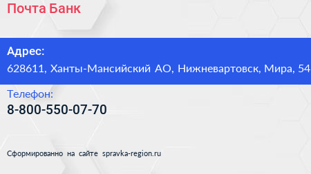 Почта Банк по адресу 628611, Ханты-Мансийский АО, Нижневартовск, Мира, 54 в дальнейшем Организация, размещена в следующих категориях: