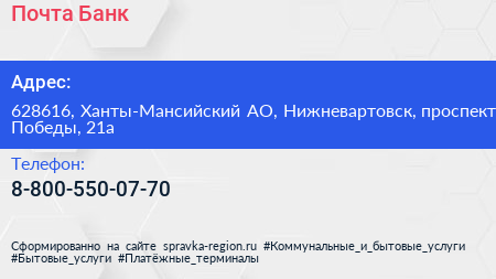 Почта Банк по адресу 628616, Ханты-Мансийский АО, Нижневартовск, проспект Победы, 21а в дальнейшем Организация, размещена в следующих категориях: