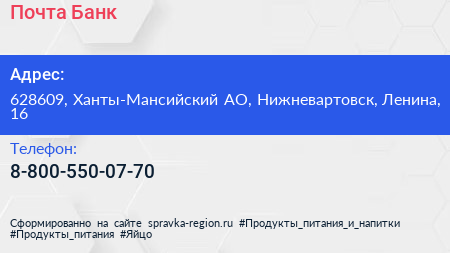 Почта Банк по адресу 628609, Ханты-Мансийский АО, Нижневартовск, Ленина, 16 в дальнейшем Организация, размещена в следующих категориях: