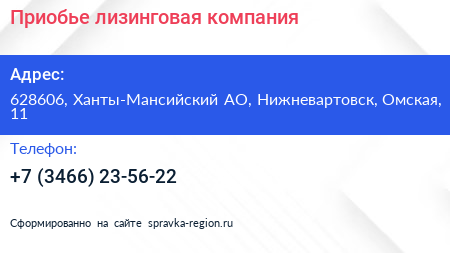 Приобье, лизинговая компания по адресу 628606, Ханты-Мансийский АО, Нижневартовск, Омская, 11 в дальнейшем Организация, размещена в следующих категориях: