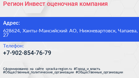 Регион-Инвест, оценочная компания по адресу 628624, Ханты-Мансийский АО, Нижневартовск, Чапаева, 27 в дальнейшем Организация, размещена в следующих категориях: