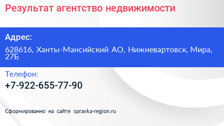 Результат, агентство недвижимости по адресу 628616, Ханты-Мансийский АО, Нижневартовск, Мира, 27Б в дальнейшем Организация, размещена в следующих категориях: