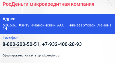 РосДеньги, микрокредитная компания по адресу 628606, Ханты-Мансийский АО, Нижневартовск, Ленина, 14 в дальнейшем Организация, размещена в следующих категориях: