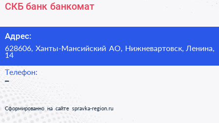 СКБ-банк, банкомат по адресу 628606, Ханты-Мансийский АО, Нижневартовск, Ленина, 14 в дальнейшем Организация, размещена в следующих категориях:
