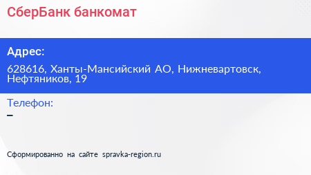 СберБанк, банкомат по адресу 628616, Ханты-Мансийский АО, Нижневартовск, Нефтяников, 19 в дальнейшем Организация, размещена в следующих категориях: