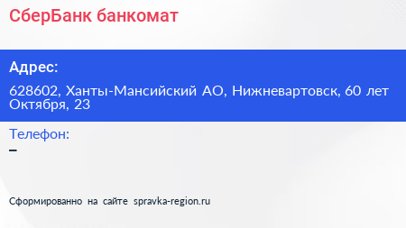 СберБанк, банкомат по адресу 628602, Ханты-Мансийский АО, Нижневартовск, 60 лет Октября, 23 в дальнейшем Организация, размещена в следующих категориях: