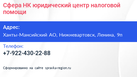 Сфера-НК, юридический центр налоговой помощи по адресу Ханты-Мансийский АО, Нижневартовск, Ленина, 9п в дальнейшем Организация, размещена в следующих категориях: