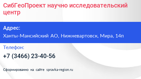 СибГеоПроект, научно-исследовательский центр по адресу Ханты-Мансийский АО, Нижневартовск, Мира, 14п в дальнейшем Организация, размещена в следующих категориях: