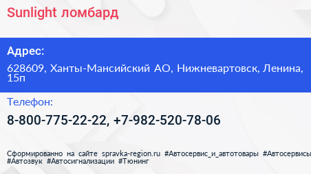 Sunlight, ломбард по адресу 628609, Ханты-Мансийский АО, Нижневартовск, Ленина, 15п в дальнейшем Организация, размещена в следующих категориях: