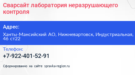 Сварсайт, лаборатория неразрушающего контроля по адресу Ханты-Мансийский АО, Нижневартовск, Индустриальная, 46 ст22 в дальнейшем Организация, размещена в следующих категориях: