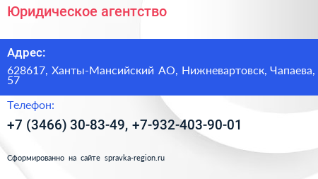Юридическое агентство по адресу 628617, Ханты-Мансийский АО, Нижневартовск, Чапаева, 57 в дальнейшем Организация, размещена в следующих категориях: