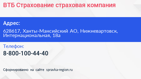 ВТБ Страхование, страховая компания по адресу 628617, Ханты-Мансийский АО, Нижневартовск, Интернациональная, 18а в дальнейшем Организация, размещена в следующих категориях: