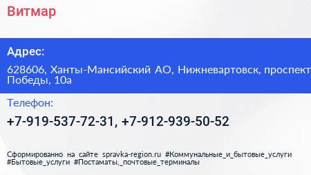 Витмар по адресу 628606, Ханты-Мансийский АО, Нижневартовск, проспект Победы, 10а в дальнейшем Организация, размещена в следующих категориях: