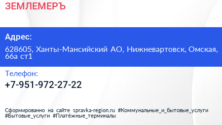ЗЕМЛЕМЕРЪ по адресу 628605, Ханты-Мансийский АО, Нижневартовск, Омская, 66а ст1 в дальнейшем Организация, размещена в следующих категориях: