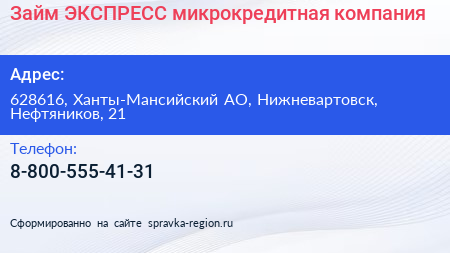 Займ ЭКСПРЕСС, микрокредитная компания по адресу 628616, Ханты-Мансийский АО, Нижневартовск, Нефтяников, 21 в дальнейшем Организация, размещена в следующих категориях: