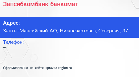 Запсибкомбанк, банкомат по адресу Ханты-Мансийский АО, Нижневартовск, Северная, 37 в дальнейшем Организация, размещена в следующих категориях: