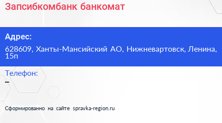 Запсибкомбанк, банкомат по адресу 628609, Ханты-Мансийский АО, Нижневартовск, Ленина, 15п в дальнейшем Организация, размещена в следующих категориях: