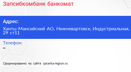 Запсибкомбанк, банкомат по адресу Ханты-Мансийский АО, Нижневартовск, Индустриальная, 29 ст11 в дальнейшем Организация, размещена в следующих категориях: